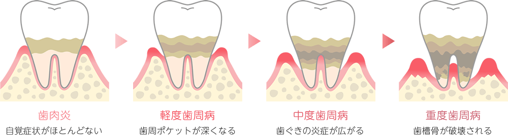 歯周病とは、歯の周りの歯ぐき (歯肉) や、歯を支える骨などが破壊される病気で、かつては歯槽しそう膿漏のうろうと呼ばれていました。歯と歯ぐきの境目 (歯周ポケット) に細菌が入り、歯肉が炎症を起こし赤く腫れて、ブラッシング時に出血します。痛みは重症化してこないと分かりません。