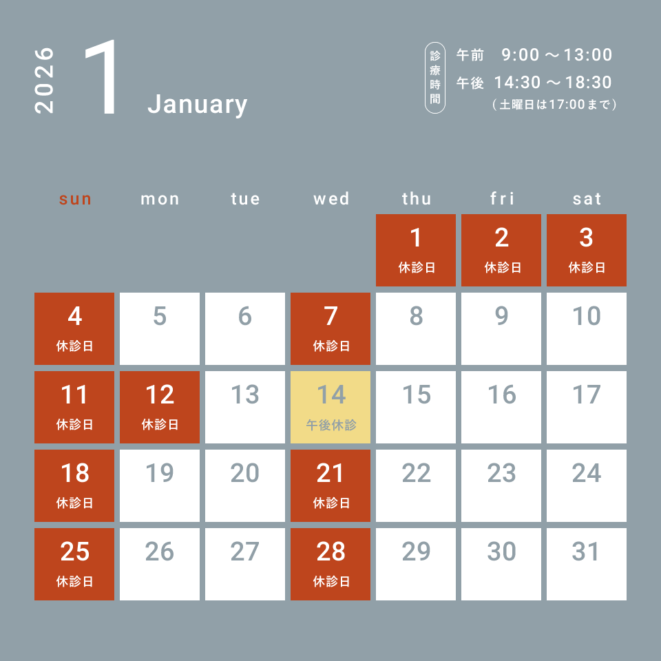 1月14日(水)は午後休診となります。予めご了承ください。宜しくお願い致します。